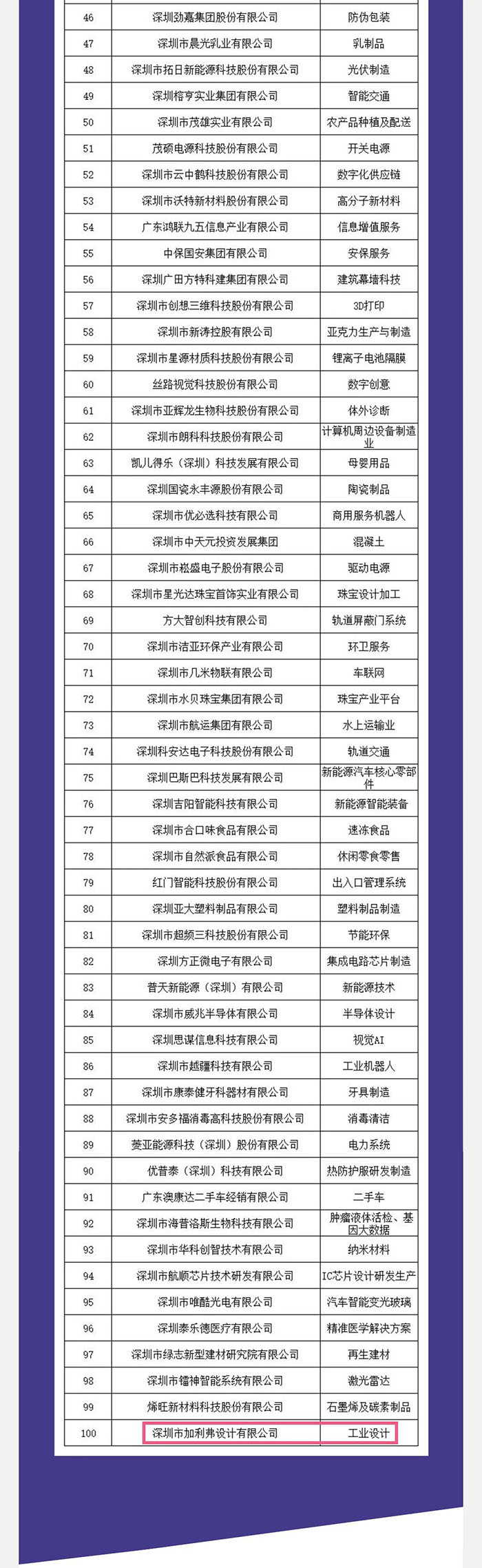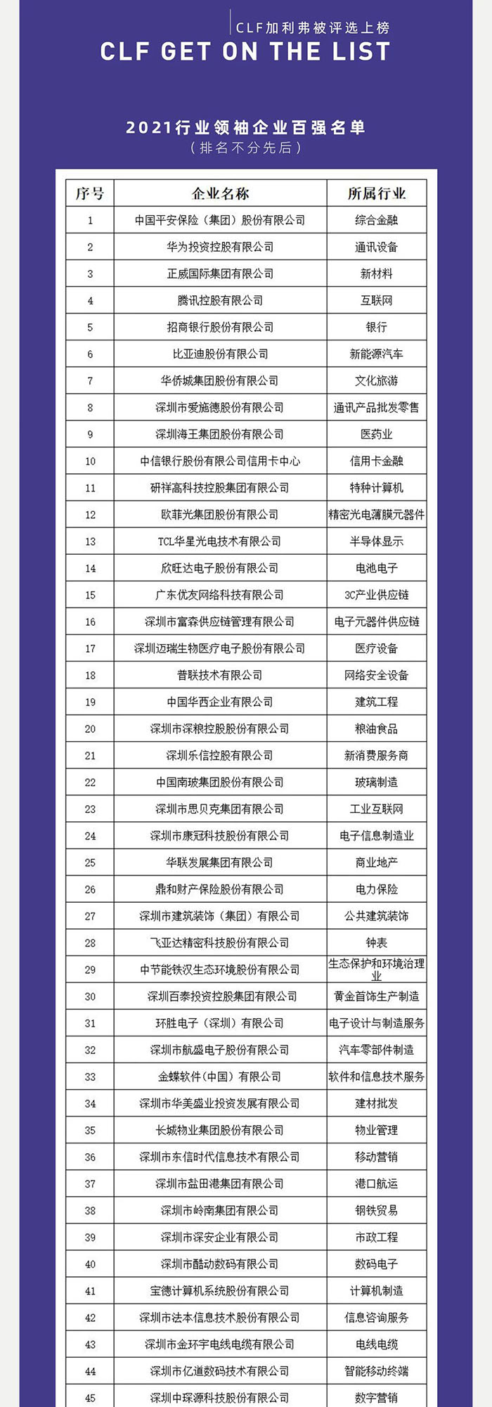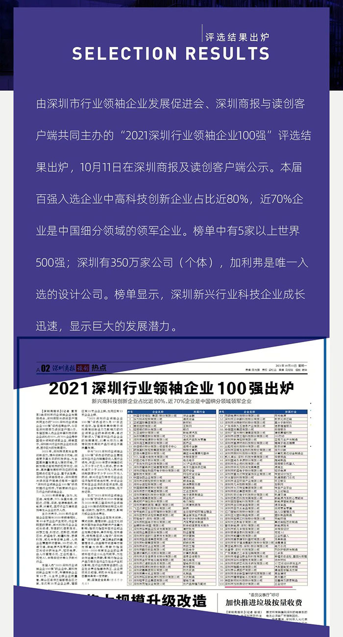 2021深圳行業(yè)領(lǐng)袖企業(yè)100強(qiáng)出爐,CLF加利弗作為唯一一家設(shè)計(jì)公司上榜