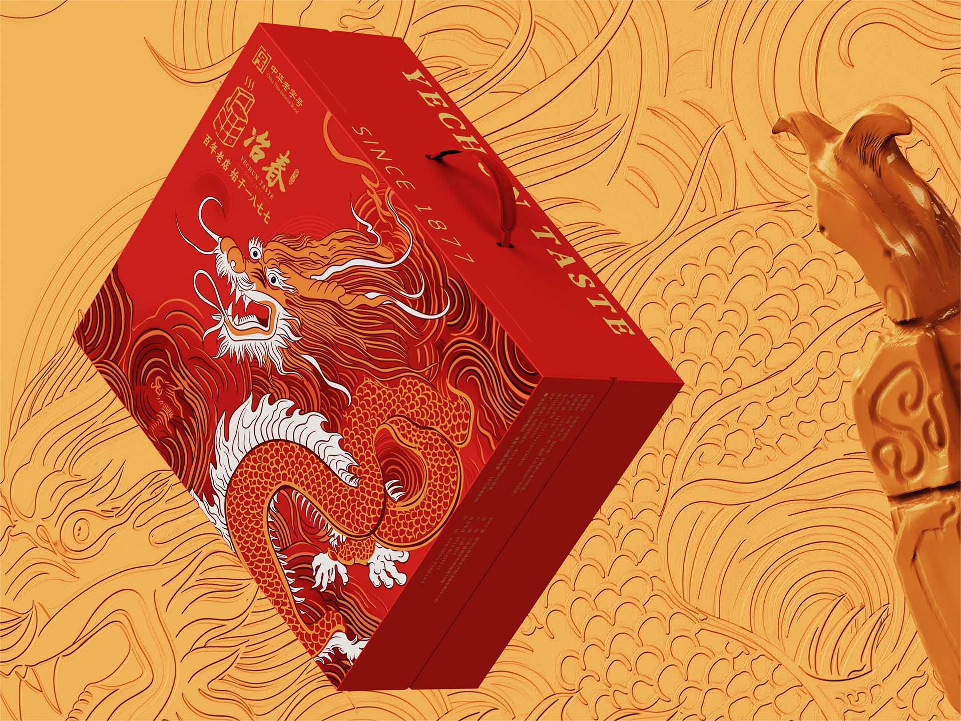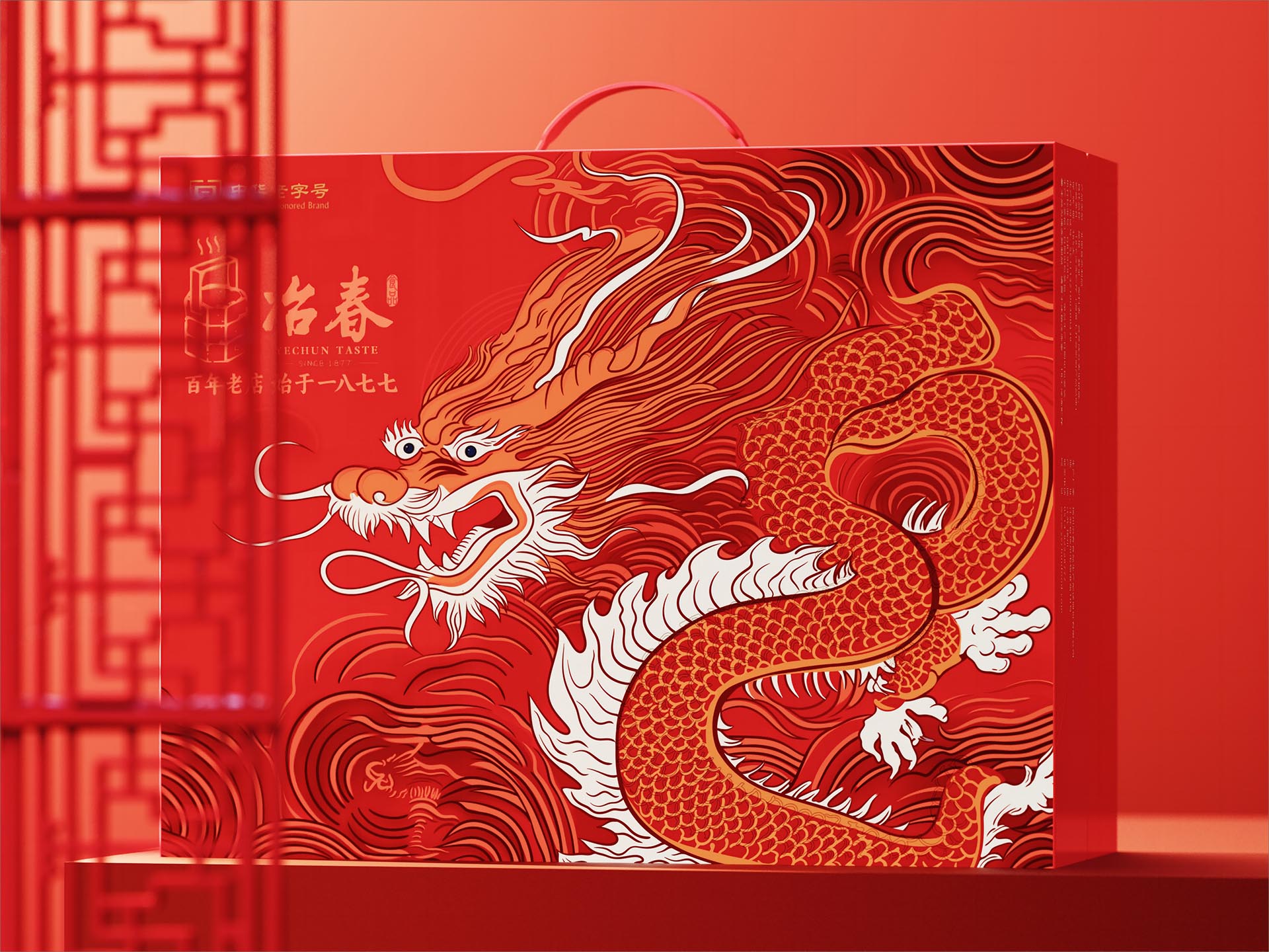 傳遞節(jié)日的歡樂與喜慶。這不僅僅是一個禮盒,更是一個傳遞情感與祝福的使者。紅色的包裝設(shè)計象征著熱情與活力,龍圖案則代表著中華民族的精神內(nèi)核。每一條龍紋都經(jīng)過精心設(shè)計,此款包裝設(shè)計既展現(xiàn)了中國傳統(tǒng)文化的魅力,又融入了現(xiàn)代審美元素。
